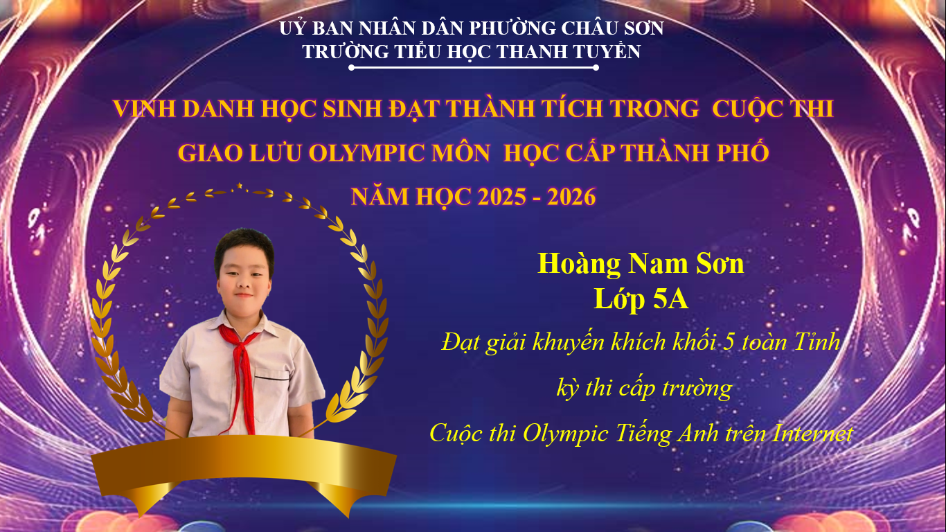 – Giải Khuyến khích khối 5 cấp Tỉnh – Cuộc thi Olympic Tiếng Anh trên Internet - Em Hoàng Nam Sơn – Lớp 5A